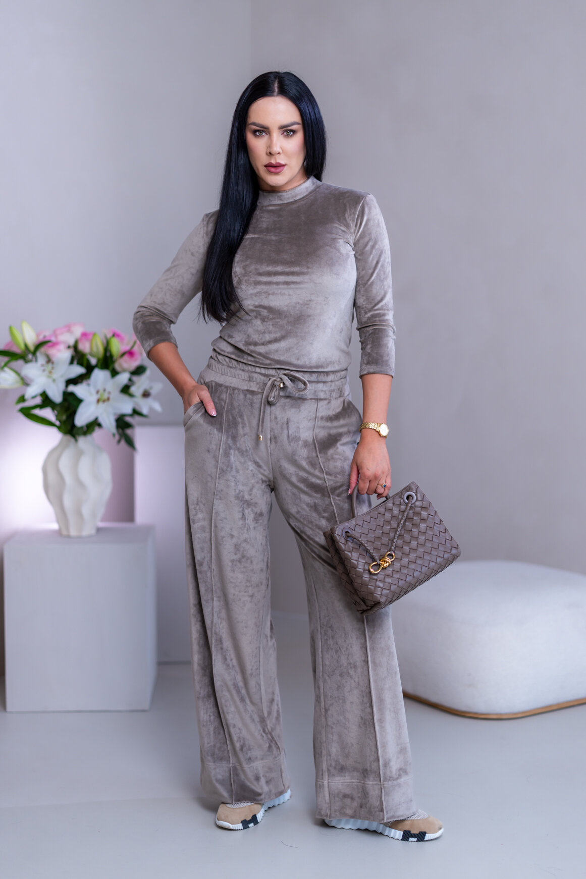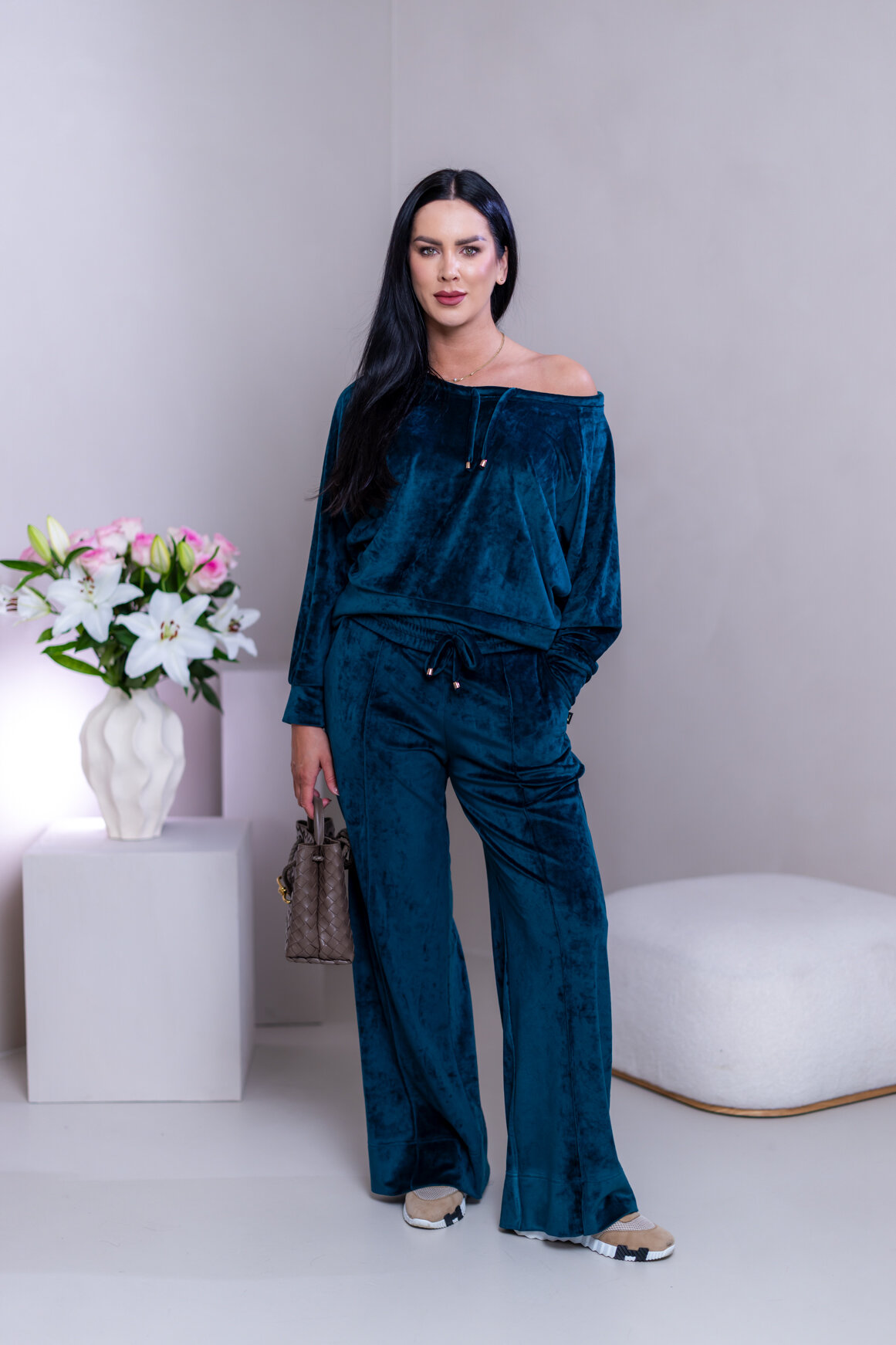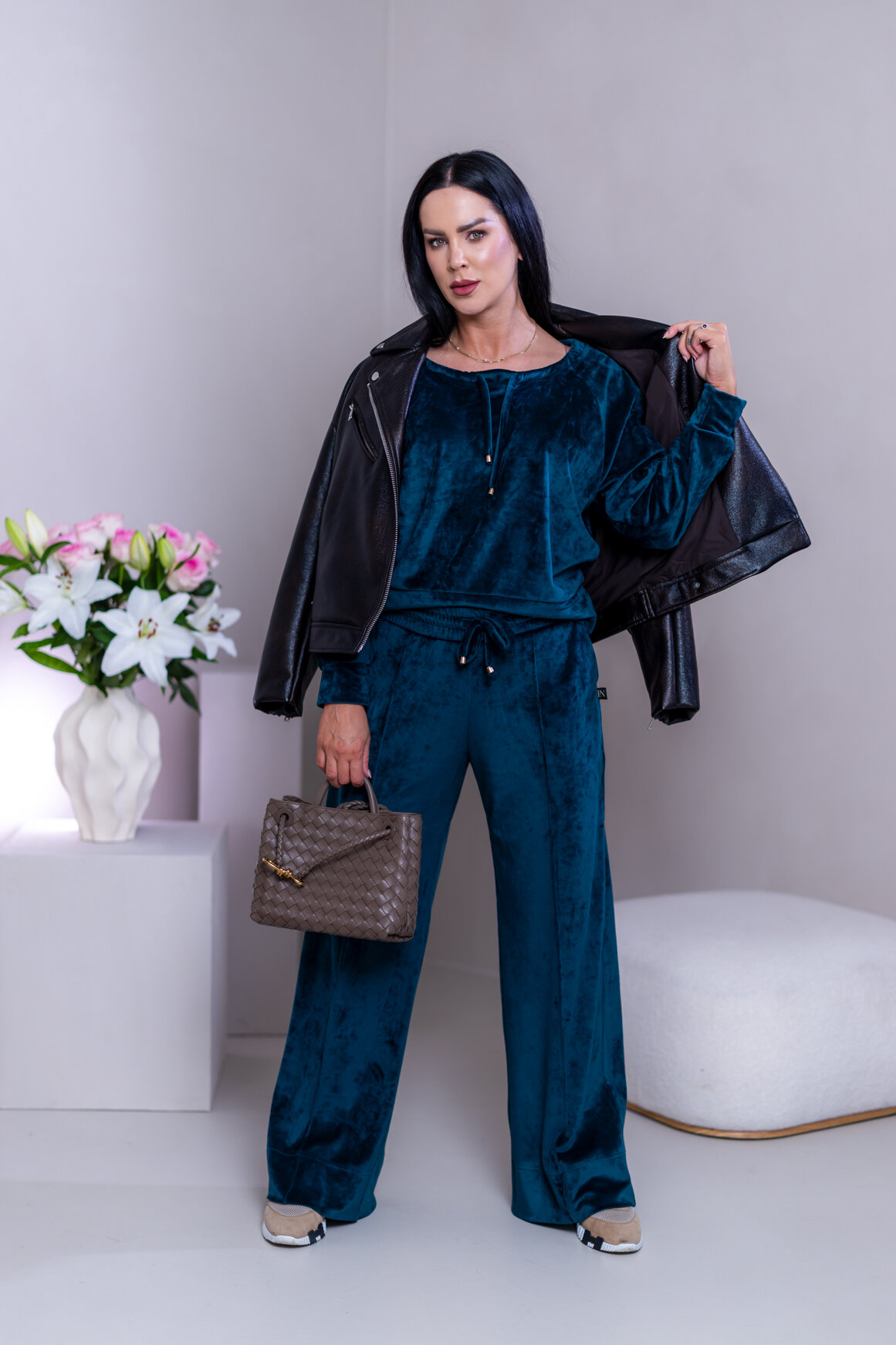 Model má oblečenú veľkosť: M - 170. Miery modelky : 91-76-99, výška postavy 174 cm.