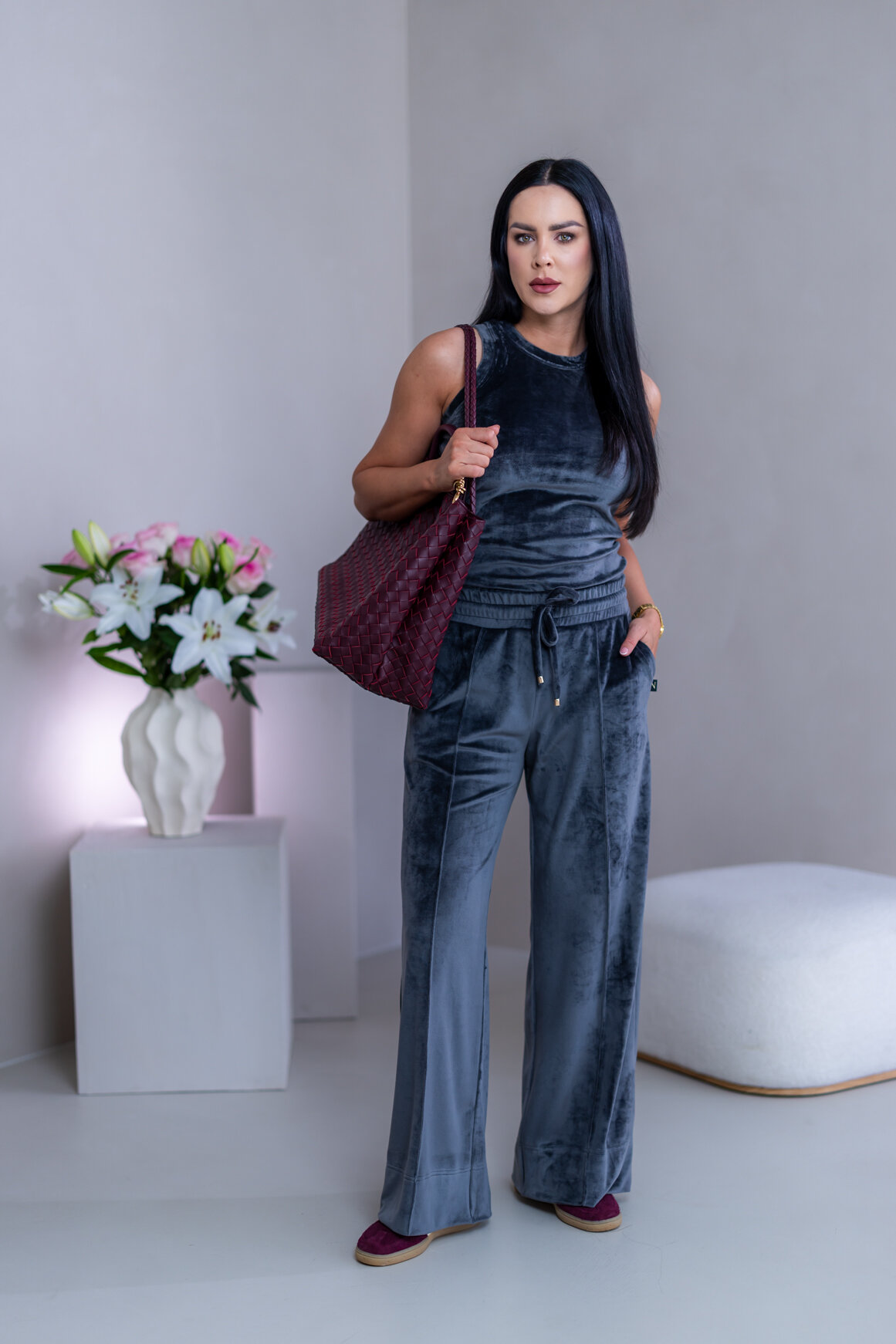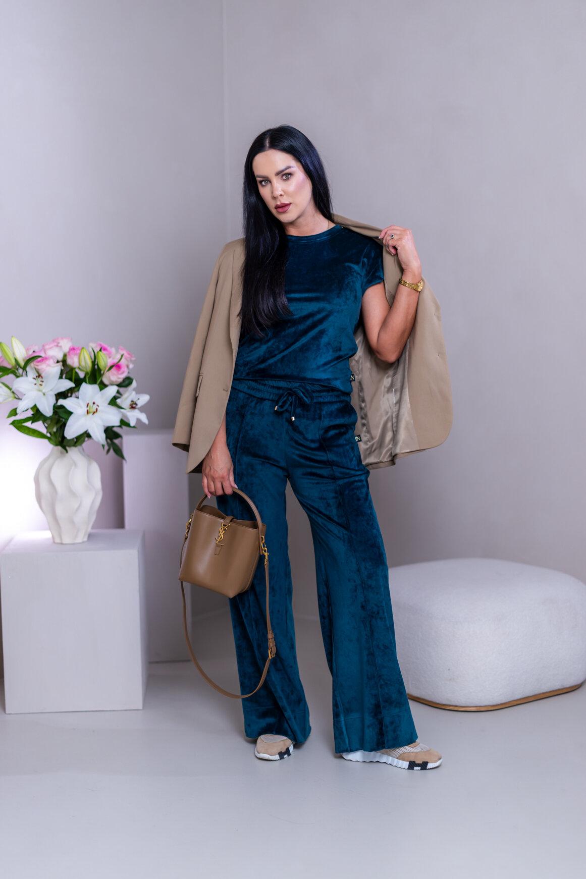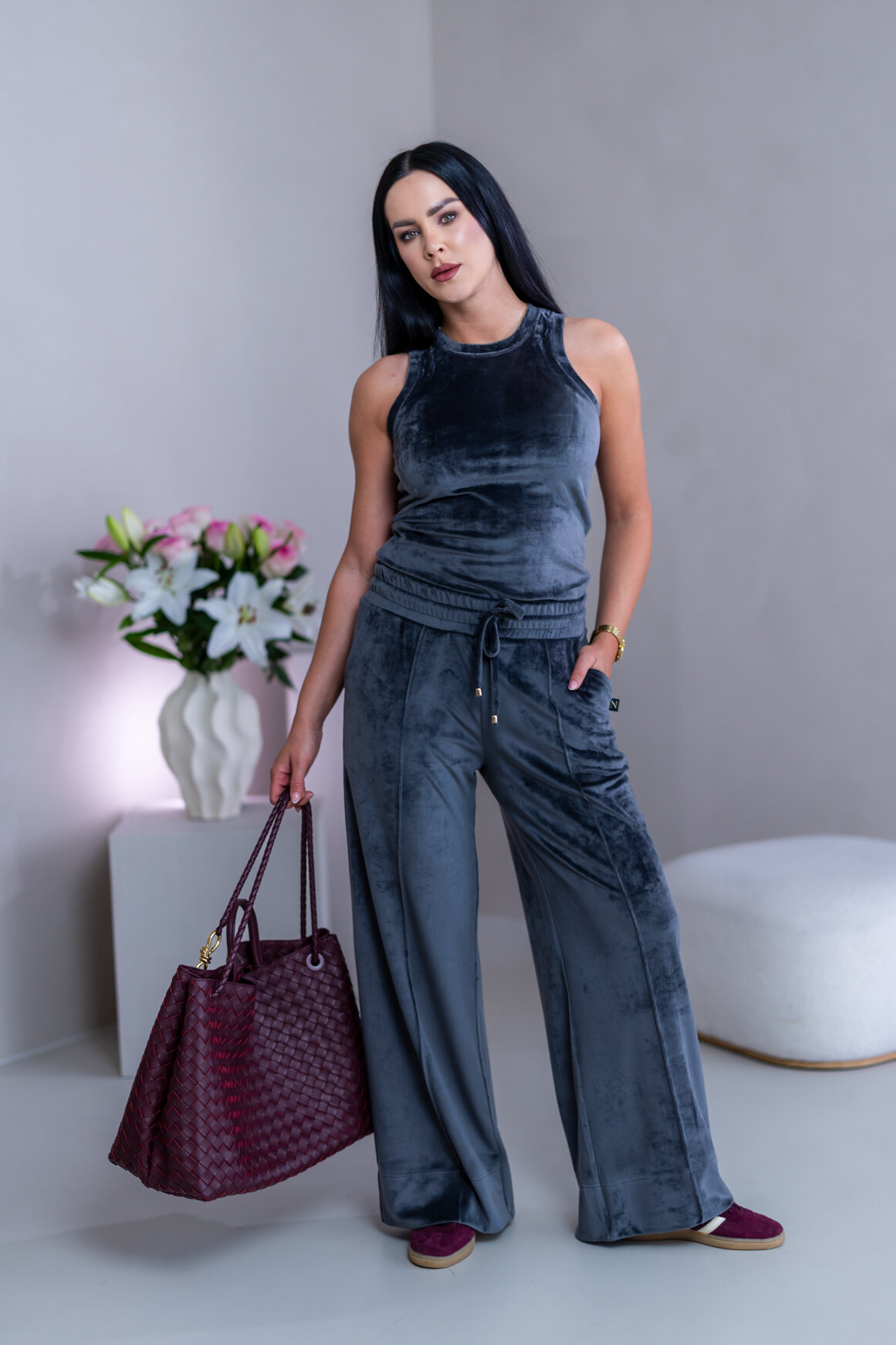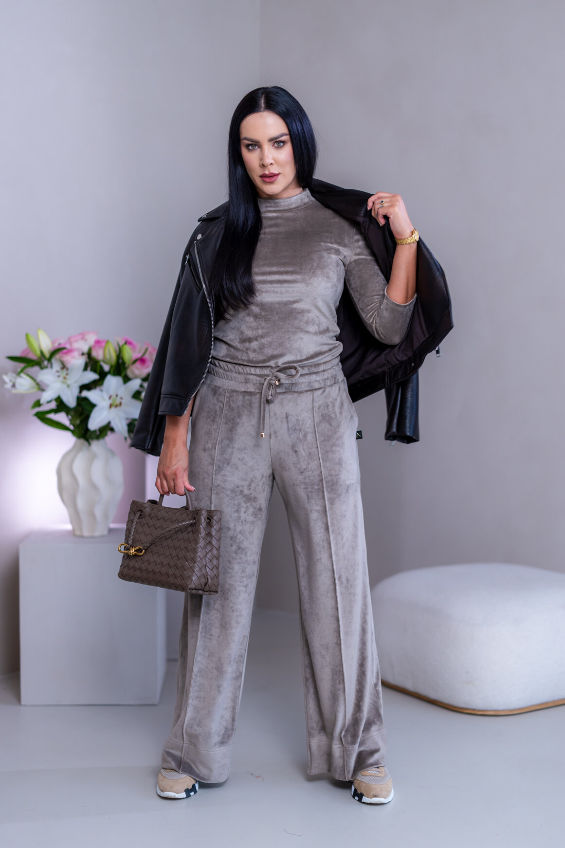 Model má oblečenú veľkosť: M - 170. Miery modelky : 91-76-99, výška postavy 174 cm.